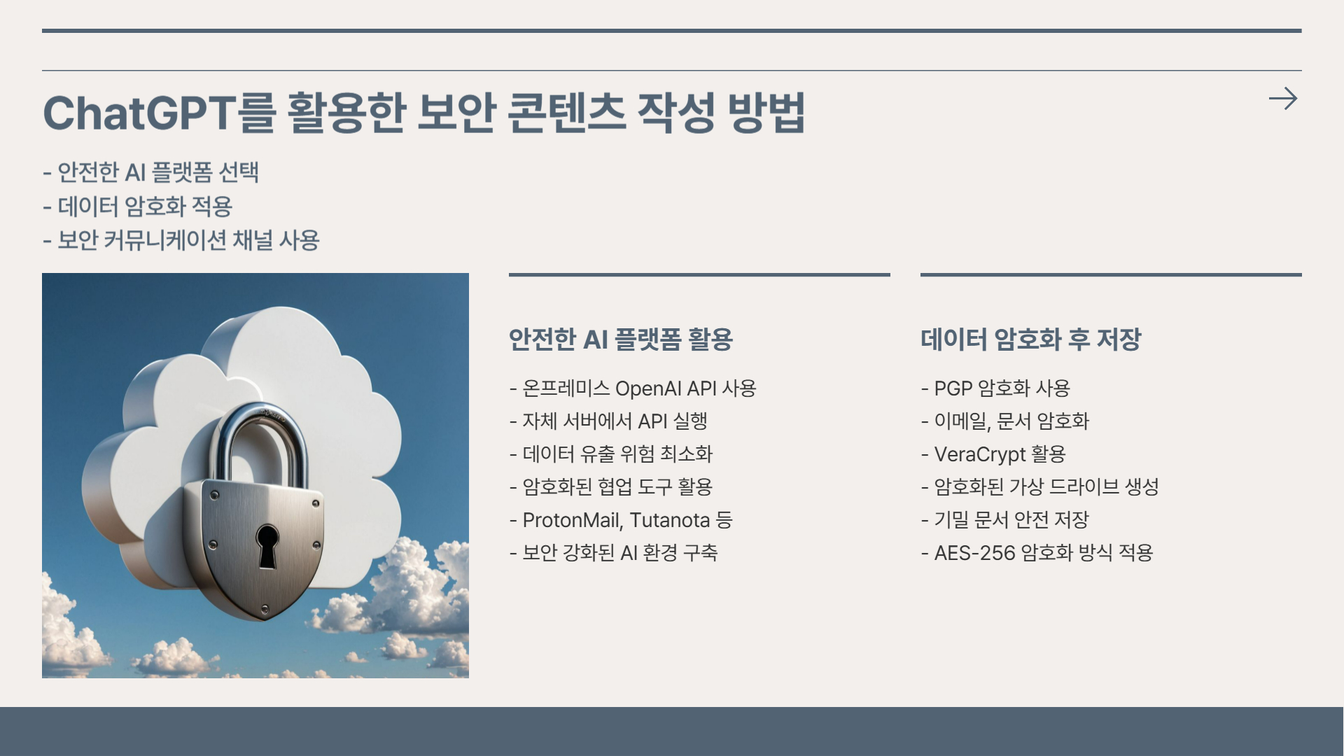 ✅ **암호화된 환경에서 ChatGPT를 사용하면 보안성이 강화된 콘텐츠 작성이 가능**합니다.