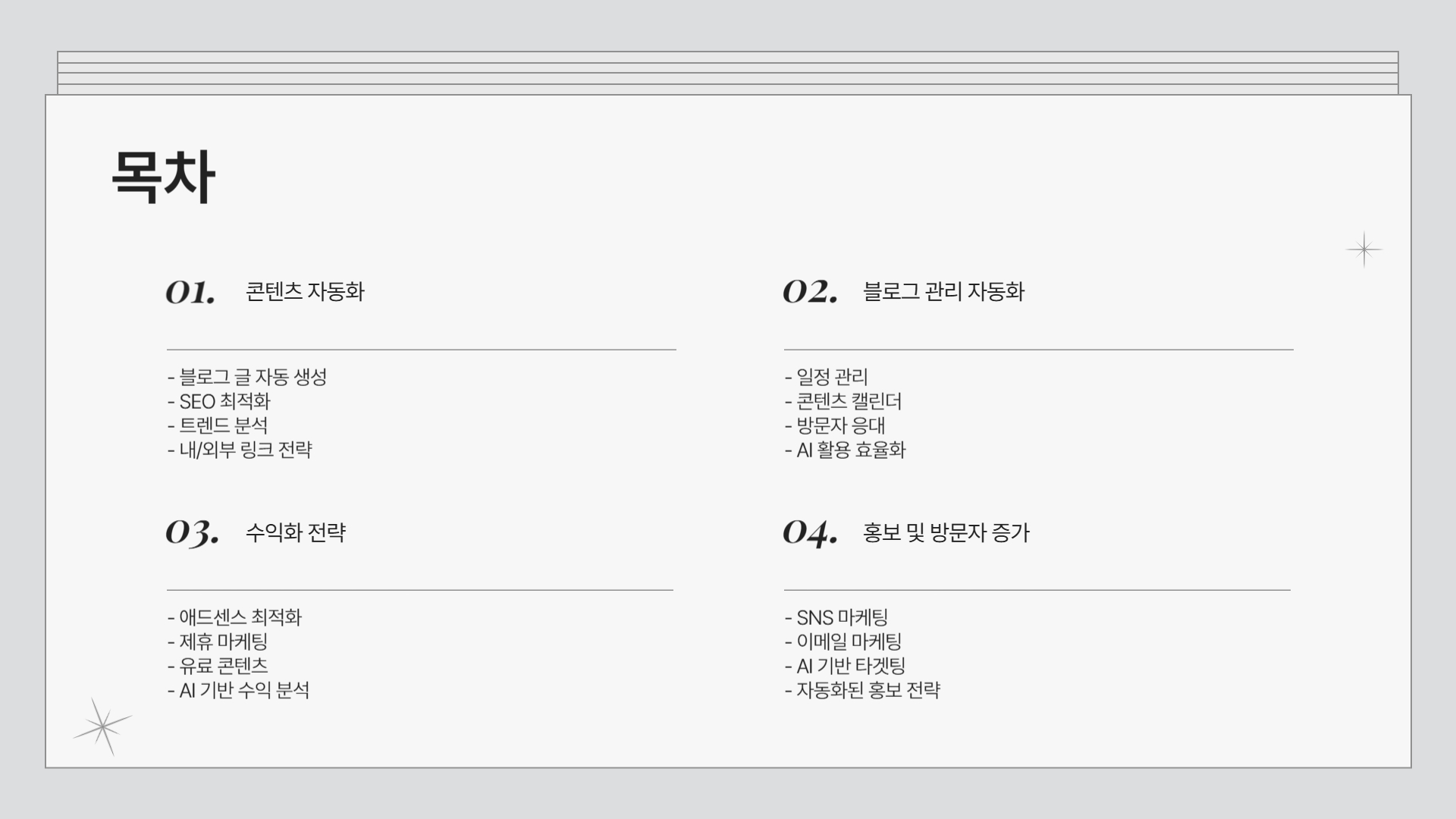 ChatGPT를 활용하면 블로그 글 작성, SEO 최적화, 내부 링크 관리, SNS 홍보, 방문자 응대, 수익화 전략까지 모든 과정을 자동화할 수 있습니다. 이를 통해 블로그 운영의 부담을 줄이고, 보다 효율적으로 수익을 창출할 수 있습니다. AI 기술을 적극적으로 활용하여 자동화된 블로그 운영을 실현해 보세요.