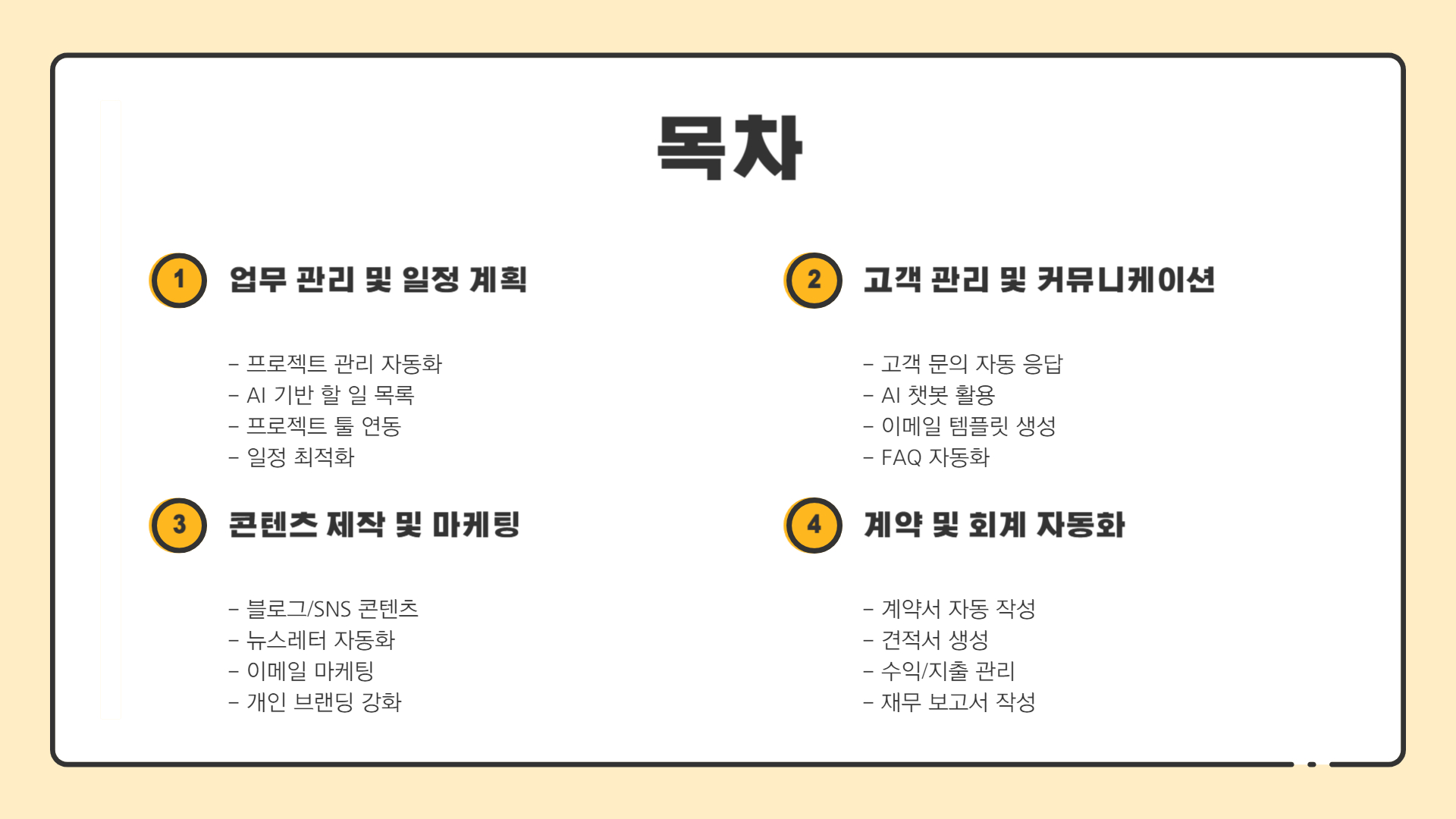 ChatGPT를 활용하면 프리랜서 업무의 많은 부분을 자동화할 수 있으며, 시간과 노력을 절약하면서도 높은 생산성을 유지할 수 있습니다. 프로젝트 관리, 고객 응대, 마케팅, 계약 및 회계 관리까지 AI를 적극 활용하면 보다 체계적이고 효과적인 프리랜서 업무 운영이 가능합니다.
