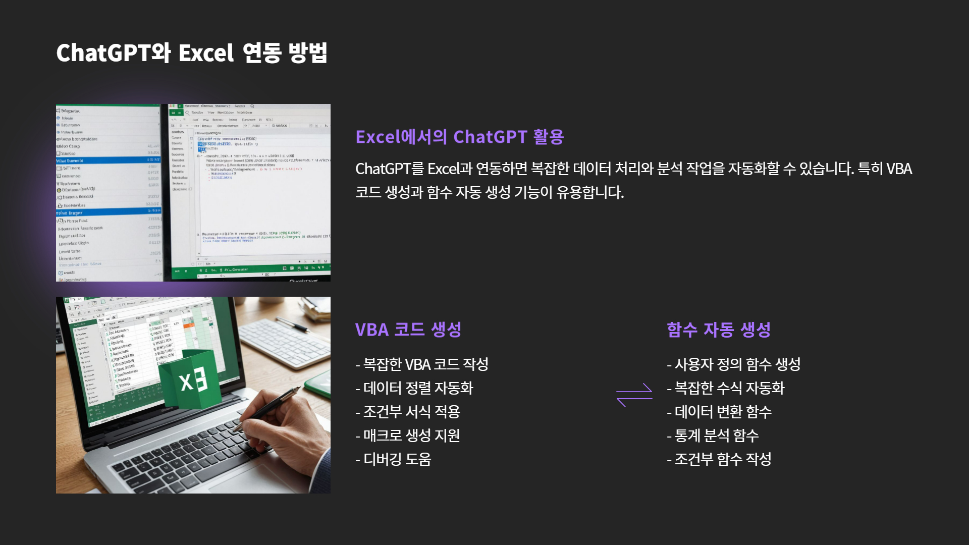 Excel에서는 SUM, AVERAGE, VLOOKUP 등의 함수를 활용하여 데이터를 분석하지만, 보다 복잡한 계산이 필요한 경우 사용자 정의 함수(UDF)를 작성해야 합니다. ChatGPT는 특정 조건에 맞는 사용자 정의 함수를 생성하여 더욱 정교한 데이터 분석을 도와줍니다.