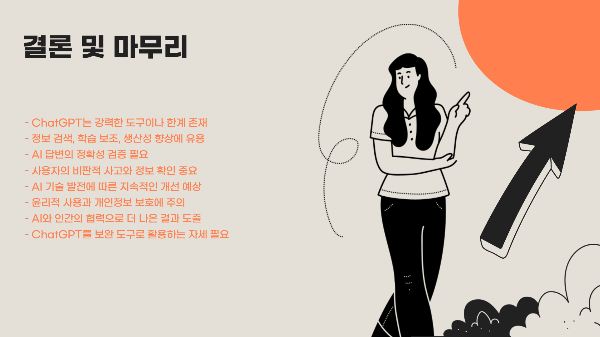 ChatGPT는 정보 검색, 학습 보조, 생산성 향상 등 다양한 용도로 활용할 수 있는 강력한 도구입니다. 그러나 AI가 제공하는 답변이 항상 정확하거나 최신 정보를 반영하는 것은 아니므로, 사용자는 정보를 검증하는 태도를 가져야 합니다. AI 기술이 발전함에 따라 ChatGPT도 점점 더 정교해지고 있지만, 인간의 판단이 여전히 중요합니다.
