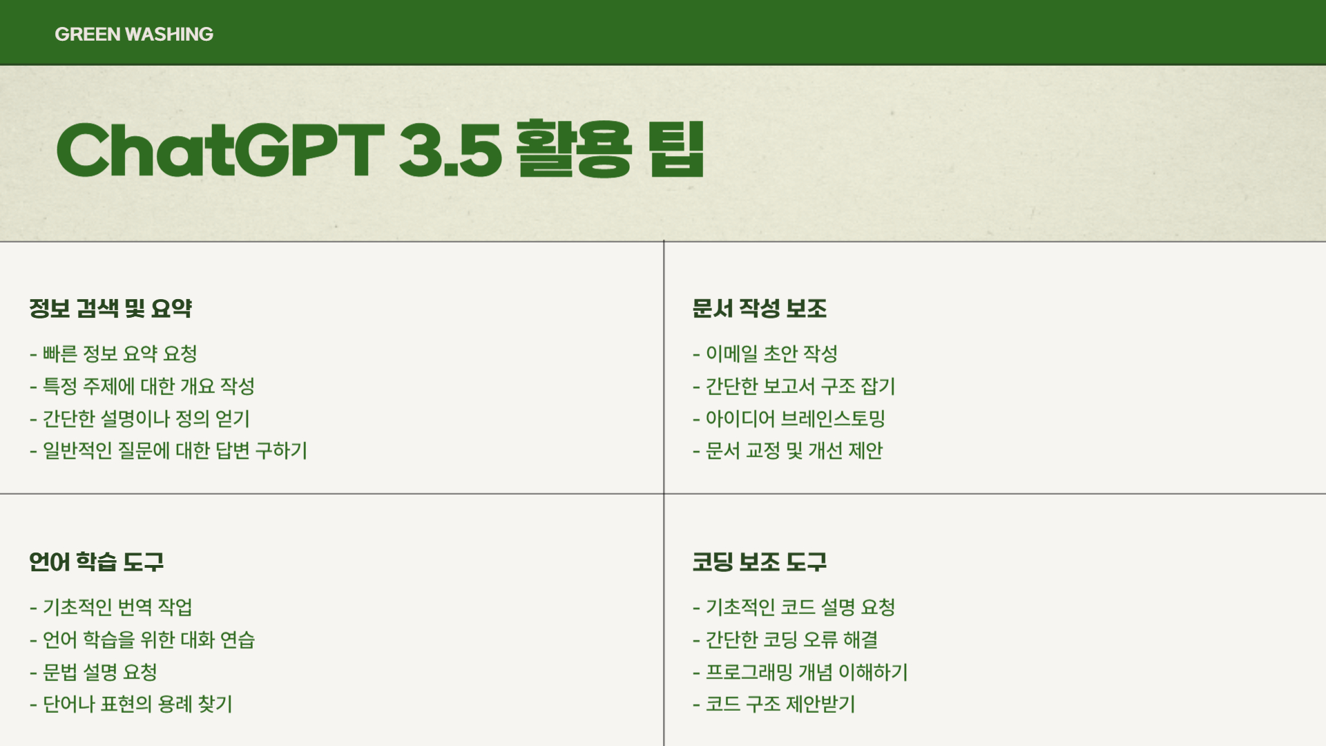 ChatGPT 3.5는 간단한 정보 검색, 이메일 초안 작성, 기초적인 코딩 보조, 외국어 번역 등 기본적인 작업에 유용합니다. 특히 학생들이 과제를 할 때 개념을 쉽게 설명받거나, 직장인들이 간단한 문서 초안을 만들 때 활용하기 좋습니다. 다만, 복잡한 문제를 해결할 때는 답변의 정확성을 신중하게 검토해야 합니다.